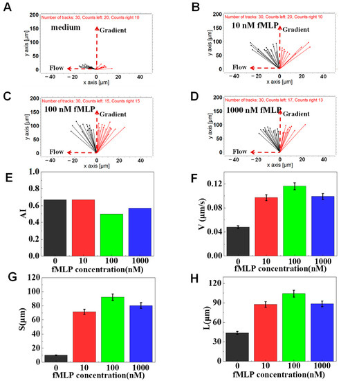 fMLP has been demonstrated to induce neutrophil chemotaxis [23]. Thus, we first validated the function of F4-Chip by testing the neutrophil transmigration in the fMLP gradients (10, 100, and 1000 nM). The results of a representative experiment showed that the neutrophils strongly migrate towards the fMLP gradients (Figure 4A–D). The values for the 100 nM and 1000 nM groups are calculated to be lower than that for the 10 nM groups. Further, , , of 10, 100, 1000 nM groups were verified to be higher than the control group (Figure 4E–H). However, the , , in the 100 nM fMLP gradient were consistently the highest. A possible reason is that appropriate fMLP can bind to corresponding high-affinity receptor proteins on neutrophils, activate neutrophils, and cause chemotaxis. However, suppose the concentration of fMLP exceeds a certain threshold. In that case, it can bind to neutrophils’ corresponding low-affinity receptor proteins, leading to the release of harmful substances such as free radicals, lysosomal enzymes, and cytokines (such as IL-6, etc.), thereby affecting their chemotaxis [41,42]. In addition, this dose-related neutrophil chemotaxis towards the fMLP gradients was partly attributed to the cell docking structure of F4-Chip. If the cells were randomly seeded in the migration channel, the response of different cells to the chemokines will be different. We believe if the docking structure was integrated into the F4-chip, all neutrophils would have the same initial perception of the gradient so that the dose-related chemotaxis could be characterized by , , . Thus, all of the following migration experiments were carried out by using 100 nM of fMLP gradient.