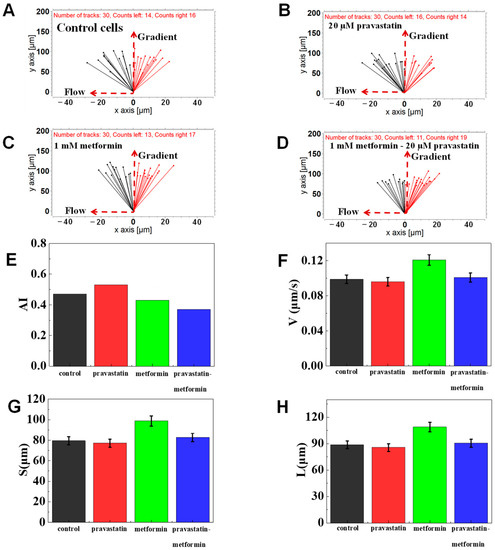 Chemotaxis of drugs-treated cells in 100 nM of fMLP chemoattractant. (A) The connecting line between the initial position and the end position of control cells. (B) The connecting line between the initial position and the end position of cells pretreated with 20 μM pravastatin. (C) The connecting line between the initial position and the end position of the cells pretreated with 1 mM metformin. (D) The connecting line between the initial position and the end position of the cells pretreated with 1 mM metformin and 20 μM pravastatin. (E–H) Comparison of quantitative cell migration parameters including drifting index (AI), cell velocity (V), the displacement along the gradient (S), and the whole movement distance (L).