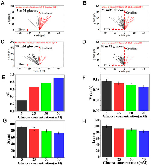 Chemotaxis of glucose-treated cells in 100 nM of fMLP gradient. (A) The connecting line between the initial position and the end position of cells pretreated with 5 mM glucose. (B) The connecting line between the initial position and the end position of cells pretreated with 25 mM glucose. (C) The connecting line between the initial position and the end position of cells pretreated with 50 mM glucose. (D) The connecting line between the initial position and the end position of cells pretreated with 70 mM glucose. (E–H) Comparison of quantitative cell migration parameters including drifting index (AI), cell velocity (V), the displacement along the gradient (S), and the whole movement distance (L).