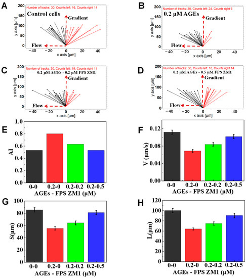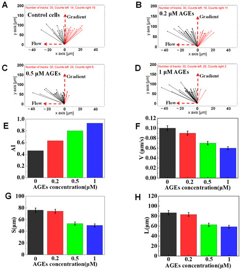 The normal serum AGEs levels in normal patients (non-diabetic, normal renal function) were around 0.13 μM. AGEs levels were elevated more than 2-fold in diabetic patients and about 8-fold in diabetics with hemodialysis [19,45]. Thus, here we focused on the effect of high concentrations of AGEs on the chemotaxis phenotyping of neutrophils. In a representative experiment, we found that different concentrations of AGEs pretreated cells could effectively transmigrate through the docking structure and migrate in the migration channels in different ways (e.g., different speeds and migration distances). In particular, AGEs pretreated cells showed stronger drifting along with the flow than the control cells (Figure 7A–D). In addition, the values of cells pretreated with 0, 0.2, 0.5, and 1.0 μM of AGEs were calculated to be 0.46, 0.63, 0.8, 0.93, respectively (Figure 7E), implying the weakened neutrophil chemotaxis like the glucose pretreated neutrophils. Further, we found that the AGEs inhibition of neutrophil migration ability was dose-dependent (as measured by , , ). The of the control cells was 0.1 μm/s, higher than that of cells pretreated with 0.2 (0.09 μm/s), 0.5 (0.07 μm/s) and 1 (0.06 μm/s) μM AGEs (Figure 7F). Gradient direction displacement and total migration distance also showed the gradually increased inhibition in chemotaxis (Figure 7G,H). The results further confirmed that AGEs treatment could induce weakened chemotaxis of transmigrated neutrophils than the control cells in 100 nM of fMLP gradient.