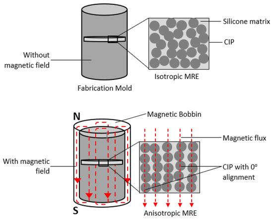 Magnetorheological elastomers (MREs) are elastomeric materials that are uniquely receptive to external magnetic stimuli because they are composed of magnetically permeable microparticles structured inside a polymer matrix [1]. MRE, as a novel smart material, has modifiable mechanical properties as a result of the interaction of magnetizable microparticles embedded in a non-magnetic matrix. In recent years, MRE has emerged as a potential solution to many material technology developments, similar to magnetorheological fluid (MRF), but in solid form. MRE materials, which are responsive to magnetic stimuli and have variable stiffness, are gaining popularity in a wide range of critical applications, including actuators [2], transport, and other structural industries. Because of the advantages of MRE, it has also become a popular material choice for advanced engineering applications. These findings highlight the importance of considering some key technological issues ahead of time. MRE is increasingly being used in critical applications such as electronics and sensing components [3], microfluidics [4], military [5], radio-absorbing devices [5], and a variety of other promising fields. MRE technology and growth in this field represent a significant step forward in the never-ending search for material optimization, as material is the final frontier of advancement. A successful curing process in MRE fabrication yields outstanding properties to meet requirements for designing a certain typical specimen geometry in testing and analysis [6,7]. The matrix has a significant impact on the properties of MRE and an appropriate matrix form and fraction should be used to induce storage modulus [8,9]. According to a review on MRE durability evaluation [10], the usual matrix used for MRE evaluation may be categorized into three types: natural rubber (NR), synthetic rubber (SR), or a combination of NR and SR. MRE is classified into isotropic and anisotropic. In isotropic MRE, the magnetic particles are uniformly dispersed in the matrix without external magnetic influence and, contrary to anisotropic MRE, the magnetic microparticles form chain-like arrangements in the matrix from strong external magnetic fields applied during the curing process [11,12]. Varying or changing process parameters during the fabrication process can easily manipulate or affect the material properties of the MRE. Therefore, special attention must be given to the fabrication process in producing MRE samples, so that the full potential of MRE is readily achievable. Furthermore, the properties of the embedded microparticles, such as size, shape, and fraction to matrix material, have a significant impact on MRE magnetic responsiveness [13]. Aside from these particle parameters, a successful study [14] established that particle surface characteristics, such as coating, play an important role in tuning the MREs’ properties. Related studies on the effect of particle fraction and arrangement of MRE were reported by previous researchers [15,16,17,18,19,20,21]. Previous research [12,22,23,24] discovered that preparing anisotropic samples by varying the spatial distribution of magnetic microparticles in the elastic matrix increased the MR effect, which warrants further experimental and theoretical study.