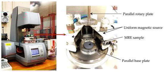 The rheological behavior of the MRE sample was tested under torsional shear mode and measured by an oscillation parallel plate rheometer (Physica MCR 302, Anton Paar Company, Graz, Austria). The rheometer was priorly initialized to desired test condition (temperature, force, and gap) and the measuring tool (rotary disc parallel plate, 20 mm diameter) was aligned and attached to the quick connector coupling. The sample was centrally placed on the stationary base mount of the rheometer and preloaded before the oscillation using rotary disc pp20 rod and then subjected to normal force during the test to avoid wall slip [31].