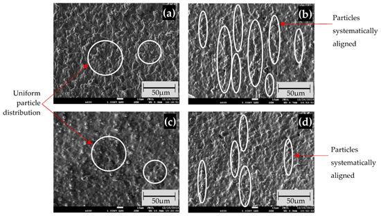 FESEM images at ×600 magnification of particle dispersion in (a) high wt% isotropic distribution; (b) high wt% anisotropic distribution; (c) low wt% isotropic distribution; and (d) low wt% anisotropic distribution. The inserted scale bar is 1:5 of FESEM original dimension.