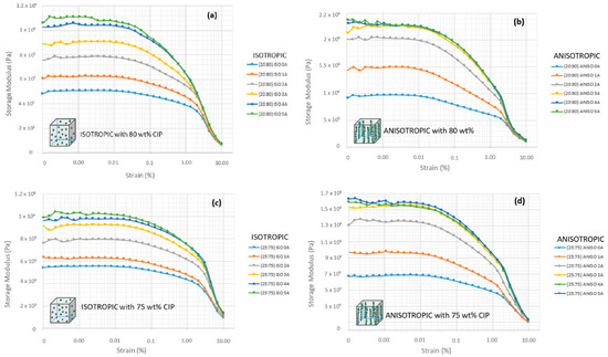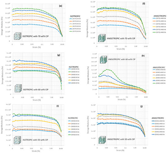 The storage modulus behavior at various microparticles fraction and alignment of (a) isotropic (ISO) sample at 80 wt% CIP; (b) anisotropic (ANISO) sample at 80 wt% CIP; (c) isotropic sample at 75 wt% CIP; (d) anisotropic sample at 75 wt% CIP; (e) isotropic sample at 70 wt% CIP; (f) anisotropic sample at 70 wt% CIP; (g) isotropic sample at 60 wt% CIP; (h) anisotropic sample at 60 wt% CIP; (i) isotropic sample at 50 wt% CIP; and (j) anisotropic sample at 50 wt% CIP.