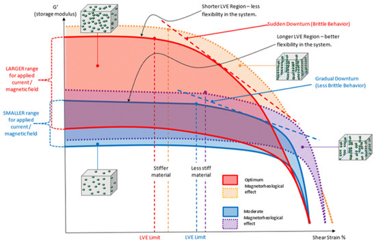 The primary motivation for measuring the energy stored in the MRE due to elastic deformation was storage modulus (G′) behavior. The establishment of storage modulus characteristic for entire particle fraction and arrangement was designated to the model of MRE behavior, as shown in Figure 5. This model is the superimposed version of the established results plotted previously and describes the effect of particle fraction on the performance of MRE at various magnetic flux applications. Higher microparticles’ fraction leads to better stiffness, but compromises the elastic potentiality. Moreover, an increasing particle content decreased the LVE region and shortened the linearity limits. As a result, the range in which the test can be carried out without destroying the structure of the sample was greatly influenced.