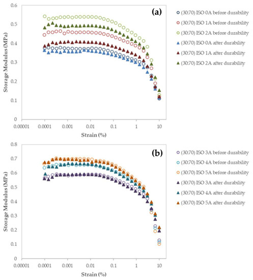 The obtained storage module was used to determine the MRE’s energy characteristic due to elastic deformation. For both types of distributions, the storage modulus behavior in samples with a high wt% of CIP exhibits significantly higher G′ than samples with a low wt% of CIP. Figure 5 depicts this with a dotted line graph. The initial G′ and its range of increment towards magnetic stimulation are the obvious differences in G′ observed in the proposed model. In terms of molecular scale durability, stress relaxation could occur and be involved by changing the structure of the molecular chain. In particular, stress relaxation phenomena in MRE have theoretically occurred via a variety of mechanisms. These include cross-link disengagement, elastic stretching, inelastic deformation, structural shift by phase transformation, microphase separation, and microplasticity. Durability, which is caused by stress relaxation, maintains the structure in a strained state for a finite interval of time, resulting in some amount of plastic strain. This plastic strain was only found in a very narrow region known as shear bands. The final stage will be the formation of shear bands as a result of localized strain. The process suffered the amorphous matrix and allows the molecular structure to undergo permanent deformation, a non-reversible change in shape in response to applied forces, at a continuously applied oscillating shear stress and constant strain [47]. The MRE’s proportionality behavior was slowly reduced as a result of the continuous applied stress at constant strain. Larger scale localization at the molecular level was developed at a wide range of test duration (84,000 s), and softening behavior to the MRE was further instigated. As a result, as shown in Figure 6, the storage modulus was observed to decrease near the end of the durability cycles.