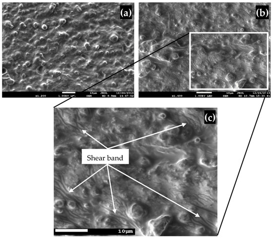 Prior to the durability test, CIP appears to be evenly distributed across the silicone rubber and varies in size. Figure 7 depicts the FESEM image of samples containing randomly dispersed particles that agrees with the FESEM images in Figure 3. Figure 7b, however, demonstrates the distinct feature of a shear band that has undergone stress relaxation. As more slippages at molecular structure level and cross-link losses occur in the MRE, the molecular structure becomes insufficiently reconfigurable, resulting in a permanent deformation (microplasticity or shear band) [47]. The image was taken from a similar MRE sample of 70 wt% CIP that was tested, and the resulting value is plotted in the graph in Figure 6. The findings revealed a link between stress relaxation and the MRE life cycle. The test parameters and MRE physical factors have both contributed to the storage modulus decrement over the specified test duration. In comparison with the previous stress relaxation studies on MRE [49,50], this relationship between microstructural failure and the storage modulus characteristic is currently the only established finding. The relaxation of stress in the MRE’s molecular structure is one possible explanation for the storage modulus and durability correlation. In Figure 7c, the presence of shear bands of varying size, thickness, pattern, and location will be the most likely evidence as the factor for storage modulus decreased after durability.