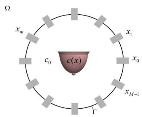 The ring array surrounds the breast tissue for which the acoustic properties need to be imaged. In this part, the propagation speed of the ultrasound signal in breast tissue is estimated [2]. In the simulation domain , it is assumed that sound propagation follows a two-dimensional wave equation: