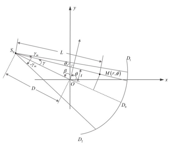 The attenuation coefficient of breast tissue was reconstructed by a filtered back-projection reconstruction method based on equiangular fan beam scanning. The parameter relationship of this method is shown in Figure 6, where the polar coordinates of point in the reconstructed image are , is the ray passing through point in fan beam, the flare angle is , and the length of line segment is . The relationships between the parameters satisfied Equation (9). and respectively represent the projections in a rotating coordinate system and in a polar coordinate system. represents the distance from the origin of the rotating coordinate system to the ray.