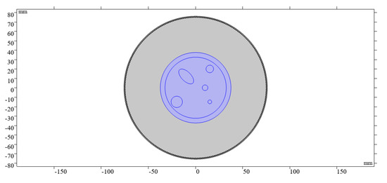 In order to verify the effectiveness of the reconstruction method proposed in this paper, projection data of ultrasound tomography imaging using the CMUT ring array are simulated by using the finite element simulation method. The ultrasound imaging system model shown in Figure 7 is established to obtain simulation data, which are close to the experimental data. The whole model is placed in an environment with water as a homogeneous background. The acquisition system is composed of a 1024-element ring array, which has a diameter of 14.8 cm, and it can completely surround the breast phantom, which includes the tumor, fibroma, cyst, calcification, fat, and glands. Specific parameters are shown in Table 1. The data acquisition process is as follows. One element is used to transmit the ultrasound signal, and all elements are simultaneously used to receive ultrasound signals each time. The 1024 elements are used as transmitting transducers in turn, and projection data are used for reconstruction of the sound speed. The attenuation coefficient can be obtained at the same time. In the whole circular scanning process, the projection data of 1024 angles were collected. The transmitted signal contained five cycles of the sine pulse signal for which the center frequency was 3 MHz and the value of peak to peak was 80 Vpp. Sound speed image updating was performed each time using a functional gradient estimated from the signals of 1024 receiving transducers. The attenuation coefficient image was reconstructed using the signals received by 768 receiving transducers directly opposite the transmitting transducer.