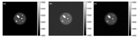 Reconstructed sound speed distribution. (a) Original sound speed distribution. (b) Reconstructed through time-reversal. (c) Reconstructed through FBP.