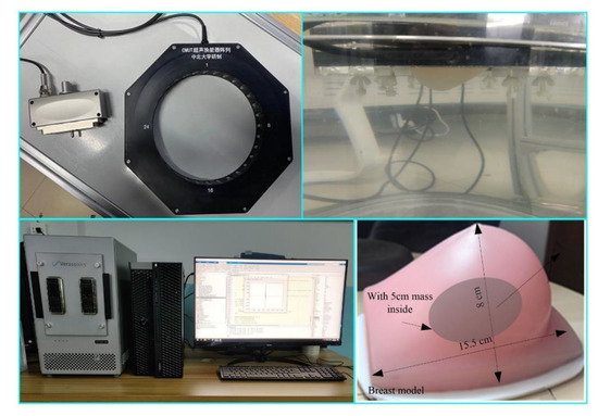 In terms of the acoustic parameter reconstruction method, USCT uses both transmission and reflection data to provide quantitative images of breast tissue acoustic properties [2,3,4,5,6]. Sound speed is the most studied propagation characteristic since it has a strong correlation with tissue density [7]. Sound speed images can provide more details of different breast tissues shapes and edges, which is helpful in distinguishing benign and malignant structures [8,9]. On the other hand, compared with sound speed, acoustic attenuation varies more with tissue types, which can provide enhanced contrast for different types of tissues [5]. Therefore, it can significantly improve the detection rate of breast micro-lesions. In conclusion, the combination of sound speed images and acoustic attenuation images can better distinguish benign and malignant tumors. According to now available literature, typical USCT systems often use a tomography algorithm based on ray theory to inverse the sound speed of breast tissue [10,11,12,13]. However, the solution of ray acoustics is not the exact one to the wave equation but rather the approximate solution under the high-frequency condition. The following assumptions must be met when it is used: first, the frequency of the acoustic wave must be high enough, and wave length should be far smaller than the size of acoustic scatter; second, there should be no energy loss in the process of sound propagation; and third, the parameters of the medium should not change with time. In fact, the range of ultrasound used by the existing breast USCT system is mainly concentrated in 1.5 MHz–3.5 MHz [14,15,16,17,18,19,20,21,22,23,24,25] frequencies, which are not high-frequency ultrasound signals. The propagation distance of ultrasound signals is concentrated in 15 cm–20 cm, in which the energy of ultrasound signals is lost. This is also what should be considered when reconstructing images. In addition, frequency and propagation distances of ultrasound signals are mutually restricted [26]. Take 3 MHz as an example: its wavelength is about 0.5 mm. The size of an early breast cancer lesion is relatively small. When it is less than the wavelength, the ultrasound produces diffraction and scattering and the part that propagates along a straight line is very small [27]. Therefore, a transmission signal carries little information about lesion tissue; furthermore, the only information needed for reconstruction of sound speed image is an estimation of the transition time. At present, the correlation function method is the most accurate and the most commonly used to extract transition time. However, this method cannot deal with the coupling signal in the received signal, the nonlinearity of circuit, or the waveform distortion. The aforementioned reasons lead to the low resolution of reconstructed sound speed image based on ray theory, and it is not possible to accurately reconstruct the a tiny lesion’s tissue for which the size is smaller than the ultrasound wavelength. To this point, ultrasound tomography based on the exact solution to the wave equation is the most accurate reconstruction method of sound speed image and has been studied by different authors. The most famous are seismology and medical imaging [28,29], but sound speed reconstruction based on wave theory is usually performed in the time domain, ignoring the existence of acoustic attenuation [30,31,32,33]. In recent years, it has been reported that the effect of acoustic attenuation reconstruction using wave theory in the frequency domain is not very good [34].