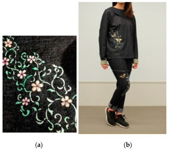 Embroidery with piezoelectric PLLA braided cord: (a) Piezoelectric PLLA embroidery pattern for sensing body motion (b) Denim pants and jacket with embroidered piezoelectric PLLA braided cord for women.