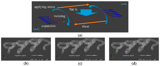 Response signal under the application of stress calculated by FEM. (a) Types of applying stress. (b) expansion (c) shear (d) twisting. Piezoelectric response signals could not be obtained in all above cases (No color by RGB pixels is corresponding to generate no piezoelectric response signal).