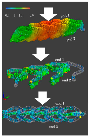 The piezoelectric PLLA braided cord exhibits a large piezoelectric response to bending displacement [3,4,5,20,21,22]. Therefore, depending on the spacing and placement of bending points on the braided cord and the symmetry of the placement, the piezoelectric response is only detectable in a specific direction of the applied stress [3,4,5,20,21,22]. For the piezoelectric PLLA embroidery designed on this basis, we previously reported that the chain stitch structure efficiently produces piezoelectric responses to various stimuli such as tension, bending, and compression [3,4,5,20,21,22]. In an embroidery pattern, in general, a piezoelectric PLLA braided cord has a part with multiple points that bend or curve steeply and a connection part between two bending points, and the cord is arranged so as to fill spaces between adjacent segments. A thread is temporary stitched on a fabric to form the desired embroidery pattern. At a point of the fabric with the embroidered pattern, the generated piezoelectric response is large. However, when used on a chair, this point is pressed against the chair by the weight of the person and is constrained between the upper surface of the chair and the thighs. A load of 70 kgW was applied to that point, and the piezoelectric response was calculated by FEM. We used the simulation software which is available on the market (Femtet: Murata Software, Kyoto, Japan), based on the FEM. The simulation software solves some physical phenomena (electric field, mechanical stress, and piezoelectricity etc.). The piezoelectric property values were used for calculating with FEM, as shown in Equations (1)–(3). As shown in Figure 3, the types of stress are tension, shear, and torsion. The figures shows that the piezoelectric response at the point was 1/100 or less, and no signal generation could be expected. Since the design is based on placing the piezoelectric braid along the plane, we considered the type of placement. However, even in such a pattern described above, when static pressure (i.e., body weight) is applied, almost no piezoelectric signal is generated even when the fabric is deformed. Therefore, we observed the magnitude of the response signal of the piezoelectric braid with slightly different heights at both ends in the radial direction. When the step was 3% or more of the radius of the piezoelectric braid, the amplitude magnitude of the response signal could be observed, as shown in Figure 4. From this result, we designed a flat oval PLLA embroidery that could be put to practical use on cushion covers. In the design, we expected that steps would naturally occur at both ends of a piezoelectric braided cord with slightly different heights realized by adjusting the diameter of the embroidery thread around the piezoelectric braid. On the basis of the structure that supports both ends, which could be analyzed by FEM, many experiments by trial and error were carried out to arrive at the design shown in the upper panel of Figure 5. FEM was carried out to confirm the piezoelectric response under static load. As a result, the piezoelectric PLLA braided cord showed a piezoelectric response and can therefore function as a sensor.