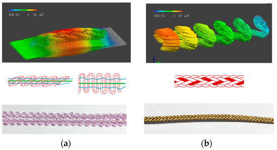 We have searched for a way to achieve the appropriate embroidery pattern. As a result, we found that embroidery blade, such as embroidery lace and knitting of embroidery braided cords, could achieve this [23,24]. Embroidery blade has a long history, and bobbins were used and to produce these blades in ancient Egypt and ancient Rome. In modern times, patterns are created by entwining, assembling, twisting, and tying dozens to hundreds of threads wound around the fulcrum in a bobbin case. It is usually made continuously with the same number of threads from the beginning to the end. Using this technique, one can produce the piezoelectric PLLA embroidery blade structure designed by FEM using piezoelectric braided cords, as one of the strings in a bobbin. The lower panels in Figure 5 show two kinds of piezoelectric PLLA embroidery blade. The left panel shows one of the tape types and the right panel of the string type.