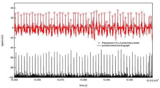 Simaluteous RRI measurement using portable ECG device and piezoelectric PLLA embroidery blade.