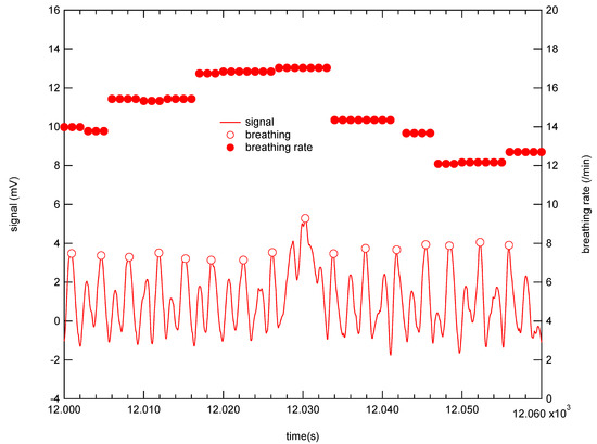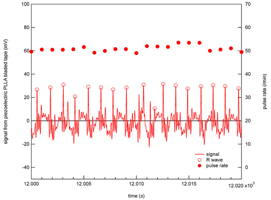 With the above system we developed, we can share data nationwide and overseas as long as an internet connection is available. Figure 11 shows an example of stored vital sign data at the Kansai University server in Osaka obtained from the vital sign sensing test conducted in Tokyo, which is located more than 400 km west of Osaka. The piezoelectric PLLA embroidery blade can measure not only body movement but also pulse waves, in long-term measurements. On the time scale shown in Figure 11, we observed body movements but we were unable to confirm the changes in pulse waves that occurred in seconds. Thus, we spent much time in analyzing the pulse waves by dividing the data every 20 s. Figure 12 shows the typical data obtained. The pulse rate per minute was converted from the peak pulse rate. As a result, we confirmed on the seconds-time scale that the newly developed sensor system does not require the removal of body movements and myoelectric noises from the original response signal in order to obtain clear pulse waves corresponding to ECG signals. Furthermore, using this system, we obtained signals corresponding to the breathing movement. Figure 13 shows the conversion of these peak intervals into respiratory rates. The signals obtained from the piezoelectric PLLA embroidery blade show that both body movements and pulse waves can be measured. As a result, we could confirm that both parameters can be reliably detected even when the subject’s position changed [25,26,27,28,29,30]. Highly reliable long-term measurement data were obtained using the developed system.