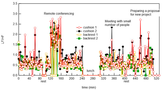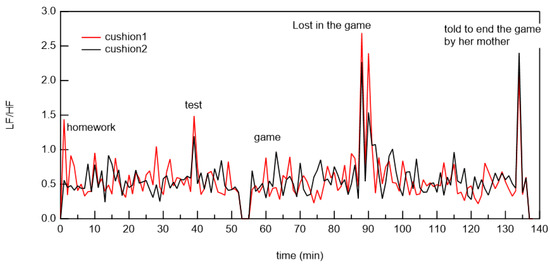 We show a typical example of LF/HF during telework in Figure 15. During measurements, the subjects were preparing materials for the conference, making presentations during the web conference, and having meetings at home. The LF/HF did not change significantly during the preparation of materials. However, at web conferences, the LF/HF increased at the beginning of the presentation. The stress level became stable as the presentation progressed. The stress level increased during discussions. Another, an example is shown in which a female elementary school student in a lower grade did her homework and then played games using her smartphone, as shown in Figure 16. Her LF/HF slightly increased before doing her homework but became almost stable as she was doing her homework. Her stress level (LF/HF) became high occasionally during playing a game. Interestingly, her stress level (LF/HF) markedly increased when her mother told her to quit the game. Currently, this method is unreliable as there are only two measurement examples. In the future, we plan to collaborate with an industrial physician to verify the accuracy of this measurement by comparing it with the physiological hormone measurement sensor value that indicates stress.