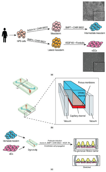 - Musah, S.; Dimitrakakis, N.; Camacho, D.M.; Church, G.M.; Ingber, D.E. Directed Differentiation of Human Induced Pluripotent Stem Cells into Mature Kidney Podocytes and Establishment of a Glomerulus Chip. Nat. Protoc. 2018, 13, 1662–1685. [Google Scholar] [CrossRef]