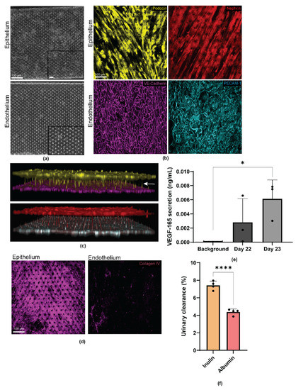 Human iPS cell derived glomerular epithelial (podocytes) and endothelial cells express mature cell markers and form foot processes extending from podocytes to endothelial cells, indicating intercellular cross talk. (a) Bright field images of the glomerular epithelia in the urinary channel and endothelium in the capillary channel. Scale bar 100 µm; (b) Representative confocal microscopy images of the podocytes and endothelial cells stained for Podocin (yellow), Nephrin (red), VE Cadherin (magenta), and PECAM-1 (cyan), respectively. Scale bar 100 µm; (c) Three-dimensional reconstruction of the epithelial to endothelial tissue–tissue interaction formed by Podocin positive (yellow) podocytes and VE Cadherin positive (magenta) endothelial cells; and Nephrin positive (red) podocytes and PECAM-1 positive (cyan) endothelial cells at the interface; arrow indicates cellular crosstalk through physical proximity; (d) Representative confocal microscopy images of collagen IV positive (magenta) glomerular epithelia in the urinary channel and endothelium in the capillary channel. Scale bar 100 µm; (e) Quantification of the VEGF-165 secretion by the mature podocytes. Background indicates culture medium not exposed to podocytes. n = 3. * p = 0.0169 and (f) Quantification of percent inulin and albumin clearance from the urinary channel of the glomerulus chip. n = 4. **** p = 0.0001.