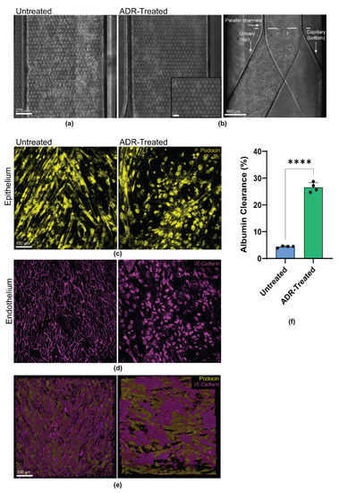 After podocyte induction, the chips were maintained in CultureBoost-R (Cell Systems SF-4Z0-500-R) for at least 5 days under fluid flow and mechanical strain before introduction of Adriamycin (LC Laboratories, Woburn, MA, USA; D-4000). viEC maintenance media was supplemented with clinically relevant doses [19,24] of Adriamycin (0.5 µg/mL) and perfused through the microvascular channel for 48 h. Next, the viEC maintenance media was supplemented with 100 μg/mL albumin conjugated to Alexa Fluor 555 (Thermo Fisher Scientific; A34786) and perfused through the microvascular channel.