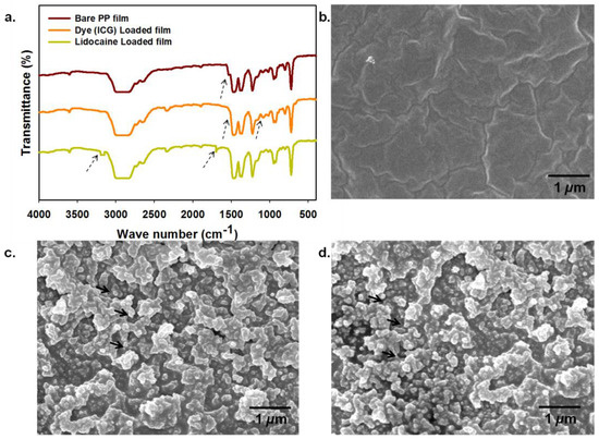 (a) The FT-IR transmission peaks of bare PP film, dye (ICG)-loaded PP film, and lidocaine-loaded PP film. The scanning electron microscopic (SEM) images (scale bar 1 μm) of (b) bare PP film, (c) dye (ICG)-loaded PP film, and (d) lidocaine-loaded PP film, where the arrow shows the site of loading in the PP film.