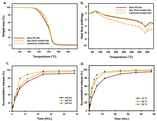 (a) TGA (thermogravimetric) studies of bare PP film, dye (ICG)-loaded film, and lidocaine-loaded PP film. (b) DSC analysis of bare PP film, dye (ICG)-loaded film, and lidocaine-loaded PP film. (c) In vitro pH-dependent (%) cumulative release of lidocaine from drug-loaded PP film at pH 4.0, 5.5, and 6.5. (d) In vitro temperature-dependent (%) cumulative release of lidocaine from drug-loaded PP film at 37 °C, 45 °C, and 55 °C at pH 5.5.
