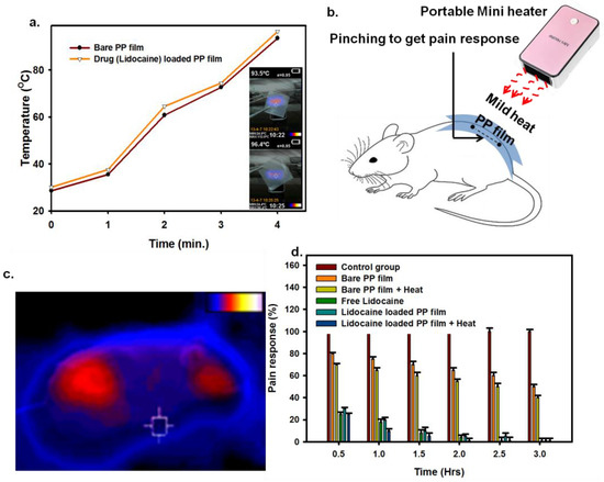Local anesthesia has been used achieve sedation with many therapeutic benefits, including postoperative surgical treatment and large-volume parenteral delivery [14]. In this view, lidocaine and lidocaine-loaded PP films were used to evaluate the pain relief response. Pinch tests used the sedation depths of applied PP film at the skin incision site. The mice with the bare PP film and heat-treated PP film showed a 50–60% increase in pain relief response compared to the control group (Figure 3d). The considerable analgesic effects of the lidocaine-loaded PP film were observed within 30 min of treatment, and the maximum outcome was recorded after 1.50 h. In another group, where mild heat at 45 °C was maintained on the applied lidocaine-loaded PP film for 5 min, the highest sedation was observed 1 h post treatment (Figure 3c,d). The externally applied heat, thus, favored drug release, allowing pain tolerance to pinching. Moreover, the application of mild temperature can stimulate local blood flow, which can support a better therapeutic response to drug molecule release. However, the fundamental factors underlying this perspective need to be further studied. The results may have been a combined effect of the released lidocaine and the mild heat (45 °C), since the mild generation of temperature has a natural sedative effect on skin [28].