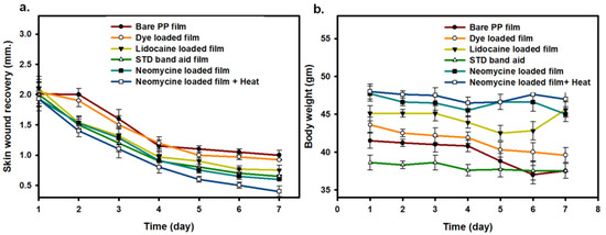 The complete recovery was also evaluated after 7 days of treatment from the external heat-treated neomycin-loaded PP film [31]. The average incision length quantified from digital images captured near the incision point shows the healing process and continuous decrease in size (mm) of the incision at 3 days, 6 days, and 7 days of observation (Supplementary Figure S3). All mice had the same incision depth (2 mm) and were administered a bare PP film or drug-loaded PP film with 5 min remote heating at 45 °C in these experiments. However, it is difficult to determine the local concentration of residual released drugs in tissue or blood, as it is not the desired goal of local applied medicine to be available in systemic blood circulation [32,33]. To investigate the physiological consequences of local treatments of PP film on mouse skin, we observed body weight changes following treatment (Figure 4b) [34]. The local application of bare or drug-loaded PP film and stimulation with mild heat did not cause any appreciable change in body weight in the treated group when comparing the first and days of observation. The mice tolerated the treatment well with no profound weight loss.