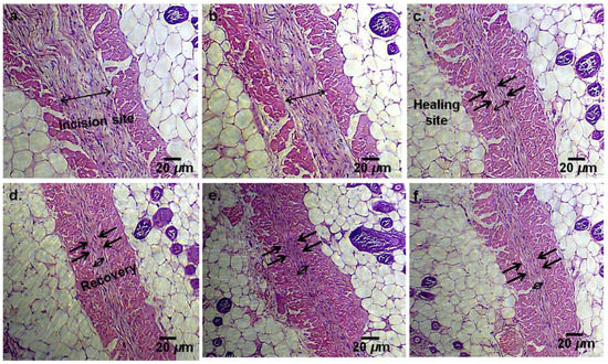 Histological (H&E staining) analysis obtained from the skin tissue area of the wound surface recovered after 7 days of treatment. Photomicrographs obtained from H&E staining of the skin wound area on day 7: (a) bare PP film, (b) dye (ICG)-loaded PP film, (c) lidocaine-loaded PP film, (d) neomycin-loaded PP film, (e) standard Band-Aid film, and (f) neomycin-loaded PP film with 5 min of portable (50 W) mini-heater (45 °C) treatment. The arrows indicate wound healing sites and wound closure areas. The scale bars represent 20 μm.
