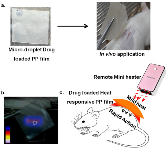 (a) Image of microdroplet drug (lidocaine) solution on PP film (1 inch × 1 inch), where complete drug loading can be achieved following a simple drying process, thus representing the proposed remote temperature-responsive local DDS for in vivo studies on dermal areas. (b) External portable mini-heater (50 W) applied to the thermo-responsive drug-loaded PP film for mild heat measurements. (c) Schematic representation showing the heat-responsive in vivo application of a drug-loaded PP film patch.