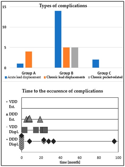 We encountered a total of five complications (10%) in group A versus 24 (23.3%) in group B and two complications (4.1%) in group C. In group A, there were only lead-related complications: one (2%) in the first month, three chronic (between 3 and 12 months) displacements of the coronary sinus lead, with an associated fracture in one, and two chronic VDD lead displacements, with no pocket related complications; in group B there were 19 (18.44%) lead-related complications: 10 acute and three chronic displacements of the coronary sinus lead, two chronic displacements of the right ventricular lead, and four acute displacements of the right atrial lead (p = 0.23), and five chronic pocket-related complications: three device exteriorizations without proven infection and two with proven infection (p = 0.17); in group C, there were only two acute lead displacements of the coronary sinus lead. The prevalence and timing of these complications are represented in Figure 1 and Table 2.