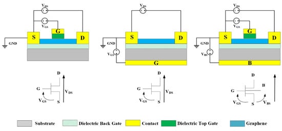 This section is dedicated to describing the three most common topologies of graphene transistors. From the literature, as shown in Figure 1, we may identify three main types of GFET, classified essentially by the gate position: top-gated graphene transistor, back-gated graphene transistor, and top-/back-gated graphene transistor.