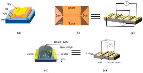 In Figure 2, three different examples of top-gated devices reported in the literature are shown. In Figure 2a, a simple case of a top-gated graphene transistor is presented. Figure 2b presents a top-two-fingers-gated device. In Figure 2c a double-top-gated equivalent topology is presented. In Figure 2d,e, a biosensor with a top-liquid gate and its architecture are presented, respectively.