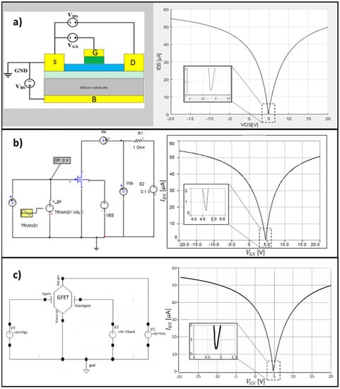 Interface of the GFET platforms: (a) MATLAB; (b) Simplorer; and (c) Cadence. The results presented for the GFET transfer characteristic were obtained from [64].