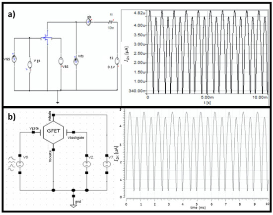 Among the several possible applications of GFETs, one is to use this device as a frequency doubler, due to the V-shaped I–V output characteristic curve of GFETs. To show the correct behavior of the model, a frequency doubler was implemented using Simplorer and Cadence, as shown in Figure 8, where a sinusoidal wave of 1 kHz was used as an input signal.