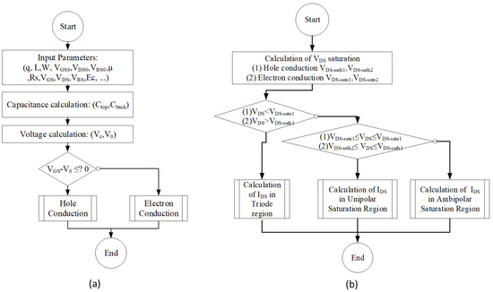 Figure 8b shows the sub-function diagram of the hole conduction and the electron conduction. For both, this function starts with the calculation of VDS-sat1 and VDS-sat2 for the hole conduction and the electron conduction, as shown in Equation (3) [65]: