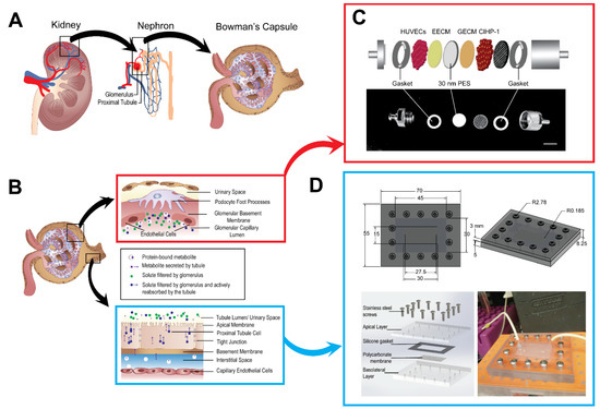 Biopharmaceutical research and development faces a major productivity crisis in the depreciating efforts to develop novel drugs [1]. Despite over 30 years of investment in biomedical sciences and the scientific tools used in drug discovery, few results have been well translated in the preclinical and clinical stages [2,3]. The reliance on conventional cell culture systems and animal models during preclinical testing hinders the establishment of human-related kidney predictive models [4,5]. Microphysiological systems (MPS) can accurately model human systems in a compact, efficient fluidic tool that can introduce controlled spatiotemporal micro-environments [6]. Such systems support measuring human responses, allow for real-time imaging, encourage cell differentiation, and pinpoint cell–cell interactions under a variety of physiological conditions [7,8,9,10,11]. Recent developments in stem cell research [12,13], regenerative medicine [14], biomaterials [15,16], tissue engineering [17,18,19,20], and microfluidics allow for integration into three-dimensional (3D) MPS.