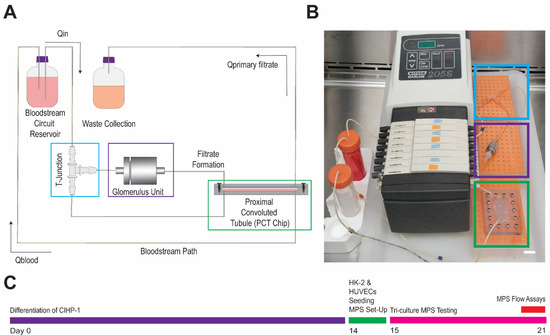 Construction of glomerulus and proximal convoluted tubule (PCT) MPS. (A) Schematic of MPS. (B) Image of MPS set-up. Bar = 15 mm. Blue = T-junction. Purple = glomerulus housing unit. Green = PCT device. (C) Timeline of MPS experiment.