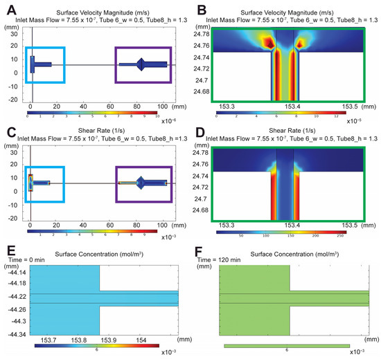2D COMSOL® velocity magnitude, shear rates, and concentration profiles. (A) Velocity magnitude (m/s) in T-junction and glomerular housing unit. (B) Velocity magnitude (m/s) in proximal convoluted tubule (PCT) device. (C) Shear tate (S−1) in T-junction and glomerular housing unit. (D) Shear rate (S−1) in PCT device. (E) Protein concentration (mg/mL) at time 0 min. (F) Protein concentration (mg/mL) at time 120 min. X and Y axes = XY geometry coordinates (mm). Blue = T-junction. Purple = glomerulus housing unit. Green = PCT device. Color bar ranges from lowest (blue) to highest measurements (red), where (A) 0–10 × 10−5 m/s, (B) 0–12 × 10−5 m/s, (C) 0–12 × 10−3 S−1, (D) 0–250 S−1, (E) 0–6 × 10−3 mol/m3, and (F) 0–6 × 10−3 mol/m3.