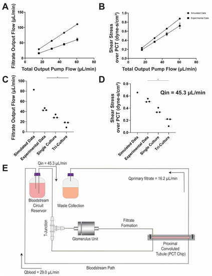 Simulated and experimental comparison of glomerulus and proximal convoluted tubule (PCT) MPS pump flow and shear stress. (A) Measured filtrate output flow (μL/min) for different total output pump flow (μL/min) in both simulated and experimental settings (0.25 mm ID tubing only). R2 = 1.0. (B) Shear stress across the apical PCT (dyne-s/cm2) for different total output pump flow (μL/min) in both simulated and experimental settings (0.25 mm ID tubing only). R2 = 1.0. (C) Scatter plot of simulated, experimental (single inlet tubing), single-culture, and tri-culture filtrate output flow under Qin = 45.3 μL/min. (D) Scatter plot of simulated, experimental (single inlet tubing), single-culture, and tri-culture shear stress (dyne-s/cm2) under Qin = 45.3 μL/min. (E) Assembled MPS flow validation. Line represents median. (* Comparison of datapoints within conditional test, p < 0.05, non-parametric one-way ANOVA.)