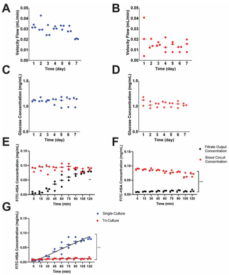 Key characteristics of a functional nephron are its blood serum protein filtration, glucose resorption, and filtrate formation capacity. Two culture conditions were established to demonstrate system characteristic differences, which was denoted as a single (proximal tubule cells only, n = 3) and tri-culture (all cell types, n = 3). Throughout the seven-day operation, primary filtrate formation was collected every 24 h in conical tubes and immediately stored at −20 °C before additional assessment. Volumes of filtrate for each culture type were weighed to measure velocity flow rate (mL/min) (Figure 5A,B). The primary filtrate formation in the single culture maintained a median of approximately 30 μL/min, and the tri-culture 15.0 μL/min. The introduction of the glomerular cells and endothelial cells created a barrier effect, reducing the flow rate within the apical PCT of the MPS to decrease shear stress from 0.3 to 0.2 dyne-s/cm2. Results of the simulated, experimental, single, and tri-culture filtrate output and shear stress across the apical region of the PCT were shown (Figure 4C,D). While the simulated model exhibited a linear behavior based on its regression (R2 = 1.0), the shear stress under experimental conditions significantly decreased in the presence of cells, suggesting that simulations provided only ideal conditions and required further parametrizations.