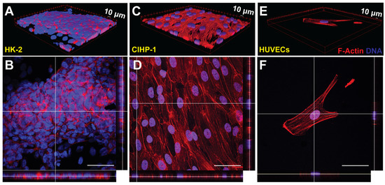 Fluorescent stains provided insight into the cellular phenotype following dynamic culture. The membranes, PCT (polycarbonate) and glomerular (PES) membranes from the MPS were removed, fixed with 4% paraformaldehyde (PFA), stained with phallodin 568) and Hoescht 33342, and imaged using a Zeiss confocal microscope at 40× magnification. F-actin cytoskeleton restructuring was imaged with phallodin 568, whereas DNA in the nuclei was counterstained with Hoescht 33342. To determine the cellular confluence, qualitative 2D orthogonal views and three-dimensional (3D) views (Figure 6A–F) were obtained. Qualitatively, the HK-2 cells on the PCT membrane (Figure 6A,B) demonstrated a monolayer behavior as previously shown [28], and quantitatively represented by the 75.3% confluence. From the 3D view of Figure 6C, finger-like projections of the podocytes validated full differentiation (day 14). The endothelial cells were highly directional in the presence of flow (Figure S1), but attachment was limited by day 7 (Figure 6E,F). This may be related to HUVECs poor ability to adapt to the dynamic crossflow culture conditions. Static conditions for all cell types were imaged for comparison (Figure S2).