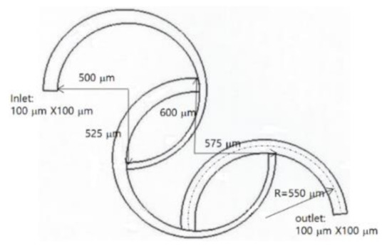 The present numerical approach was validated by simulating the micromixer examined by Sheu et al. [27]. Figure 5 presents a schematic diagram consisting of three circular channels. The second and third channels were connected 180° away from the beginning of the first and second channels, respectively. The first and second circular channels were three-quarters long, and their cross-sections were rectangular. The width tapered from 100 μm to 50 μm while the depth was kept constant at 100 μm. The third channel was 180° long and its cross-section was a square 100 μm in length. The radius of curvature of all three circular channels was 550 μm.