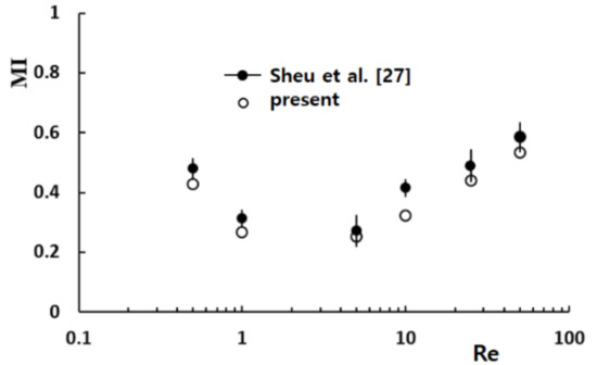 Figure 6 compares the present simulation results with the corresponding experimental data reported by Sheu et al. [27]. The present simulation predicted the variation of MI with the Reynolds number, and the discrepancy between the simulation results and the experimental data was acceptable. The discrepancy was attributed to several factors, including numerical diffusion and experimental uncertainty.