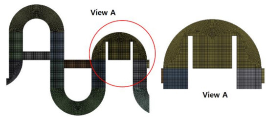 For the combined micromixers used in this paper, the grid independence of numerical simulations was also studied, and the micromixer depicted in Figure 4 was chosen to simulate for Re = 0.5. The grid independence test was carried out by varying the edge size of every cell from 4 μm to 6 μm. Figure 7 shows a typical example of grid around the two mixing units; all the grids in the outside of the MC-B are structured. The edge size of all the cells was limited to less than or equal to a specified value; it was varied from 4 μm to 6 μm for the grid independence test.