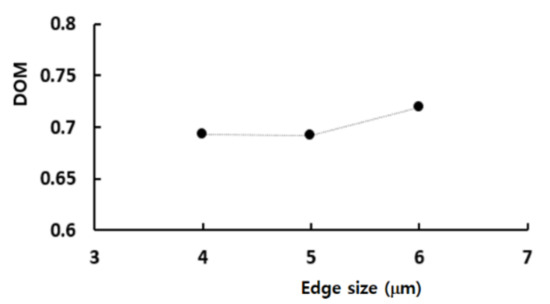 Figure 8 shows the simulated DOM for the edge size from 4 μm to 6 μm. The DOM decreased with the edge size of the computational cell, as expected. This behavior was attributed mainly to reduction of the numerical diffusion. The deviations of the 5 μm and 6 μm solutions from the 4 μm solution were 0.1% and 4%, respectively. Therefore, 5 μm was determined to be small enough to obtain solutions with reasonable accuracy.