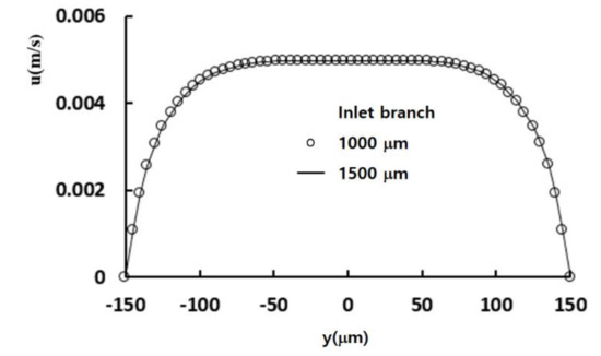 To evaluate the effects of inlet boundary conditions on the mixing performance, an additional set of computations were carried out for Re = 0.5. The DOM at the cross-section of the confluence of the two streams (plane C in Figure 4) was calculated for two different lengths of the inlet branch: 1000 μm and 1500 μm. The simulated DOMs were 0.041399 and 0.041379 for 1000 μm and 1500 μm, respectively. The difference between them was about 0.05%, and the assumption of uniform velocity at the inlet boundary had negligible effects on the mixing performance. Figure 9 shows a comparison of the velocity component, in the x-direction, along the center line at the cross section of the confluence and along the line of mid-width at the plane C in Figure 4. It also confirmed that the inlet branch of 1000 μm was long enough to neglect the effects of uniform velocity assumption at the inlet boundary on the micromixer flow.