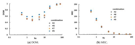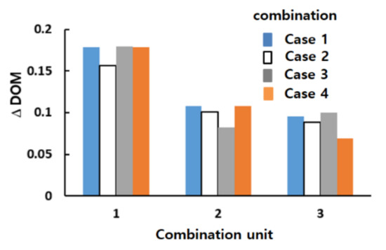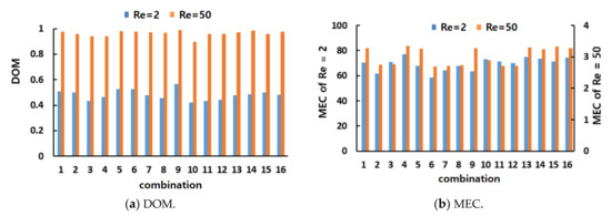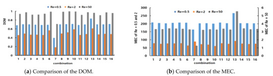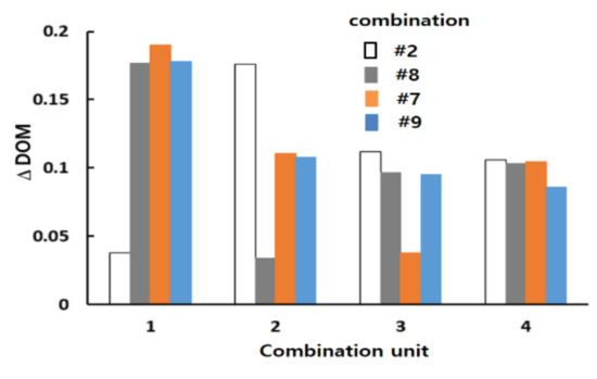 Figure 15 shows how the general combination scheme affected the DOM enhancement in the corresponding combination unit (the DOM increment in each combination unit of the four combinations for Re = 2). For example, the DOM increment in the first combination unit was calculated by the difference in the DOM between planes 0 and 1 in Figure 4. Compared to the increase in combination #9, the other combinations each showed a smaller increase in one of the four combination units. For example, the increase in the first combination unit of combination #2 was smaller than other combinations. Combination #2 did not adopt the general combination scheme in the first combination unit. Similarly, combinations #8 and #7 showed smaller increments in the second and third combination units, respectively.